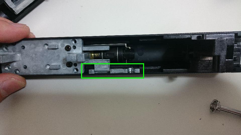 ストライカーユニットをスライドの定位置にはめ込んでも、ネジを垂直に挿入しないと本来のネジ穴にネジが入らないことがある。ストライカーユニットとネジが干渉するためただネジを突っ込むだけだと写真赤枠の位置にネジが入ってしまう模様。ネジが入らないように隙間埋めとけよ・・・