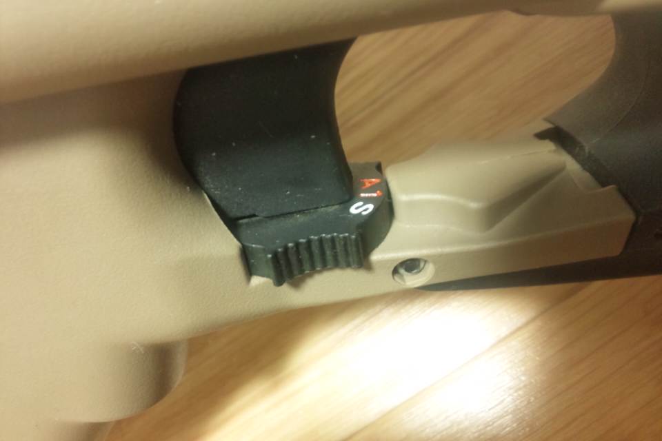 セレクタレバーはトリガーの下にありセイフティー・セミ・セミ&フルに切り換る。
