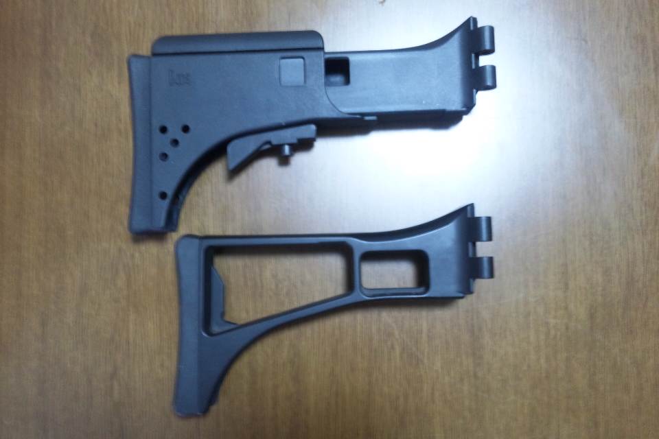 UFC製Vストックとはストックロック部分の形状が異なる。(スリング用の穴がない、最縮時にインナボックスとアウタボックスの高さが合うようになってない)