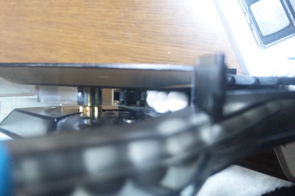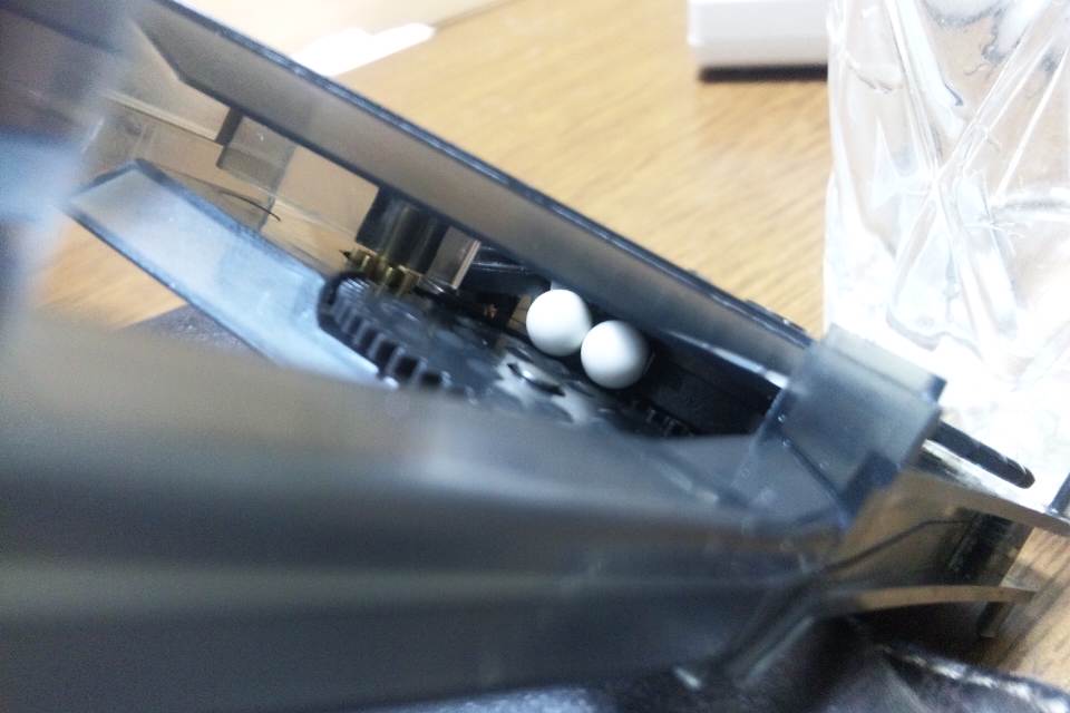 原因2:ガイドローラーと給弾ギアの隙間が狭すぎるガイドローラーが斜めになっているため、ガイドローラーと給弾ギア(スプロケット?)の隙間がBB弾1つ分の幅より狭くなっています。このため、ガイドローラーより先に弾がスムーズ進まず、突っかかっては動き突っかかっては動きを繰り返します。