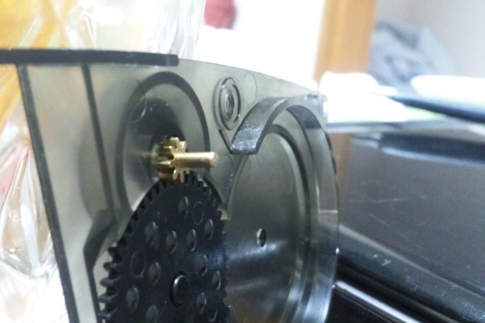 先に入ろうとしたBB弾が斜めに付いたガイドローラーによって横に押されて、ギアの溝にはまってます。