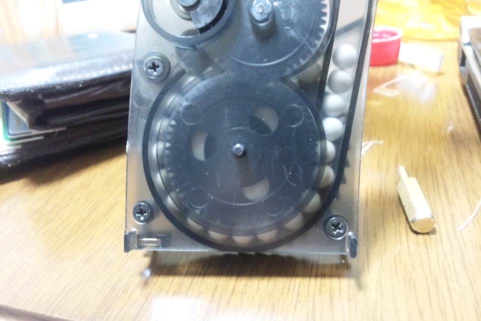 セミオートで撃つたびにマガジン内からガシャッ、ガシャッと音がするのはこれが原因です。ゼンマイ巻き量に比べて給弾数が少ないのもこれが原因です。